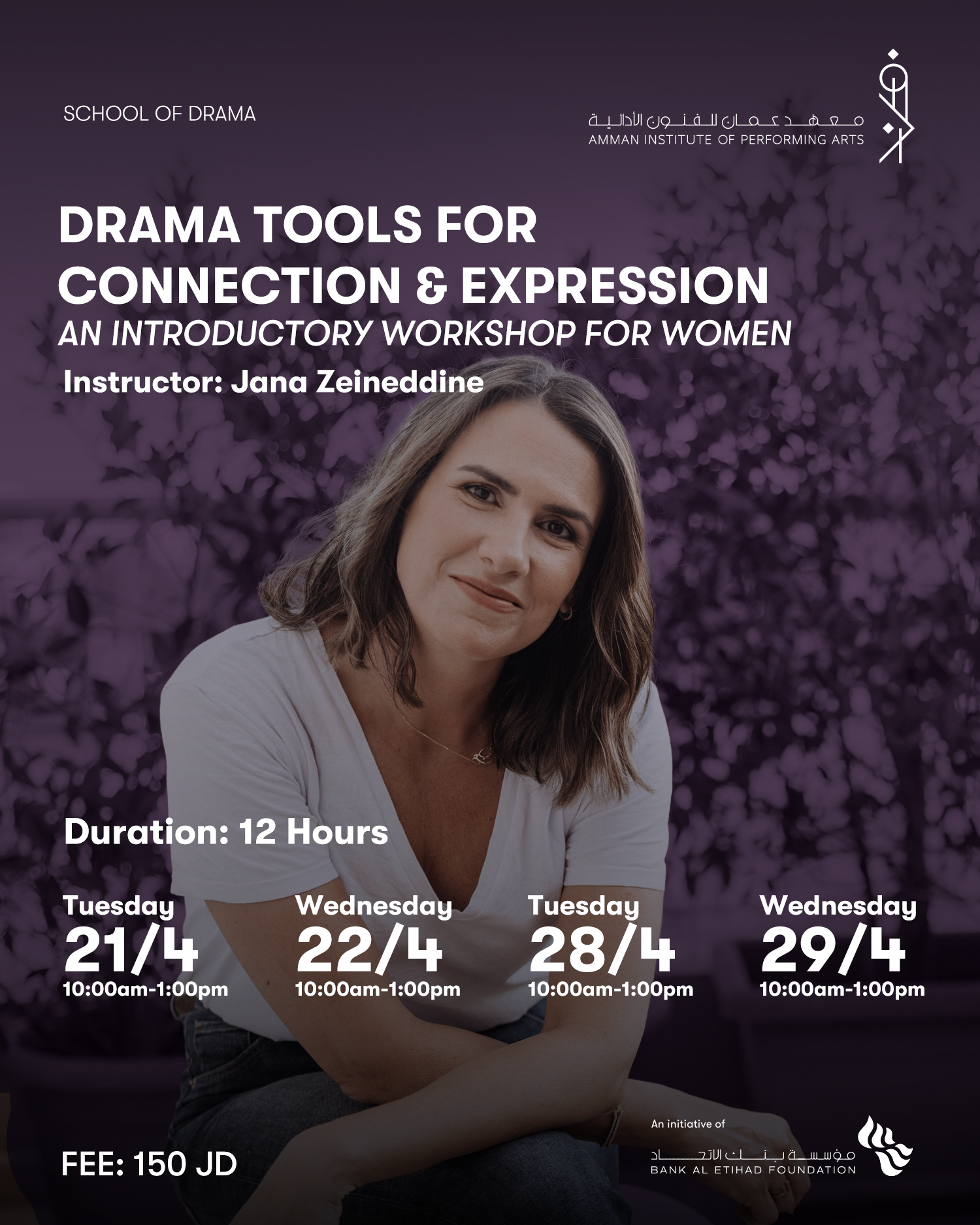 Jana is eager to teach, motivate and inspire aspiring adult actors in Jordan through the Amman Institute of Performing Arts (AIPA) to achieve their goals of becoming professional actors for theatre, stage and film.